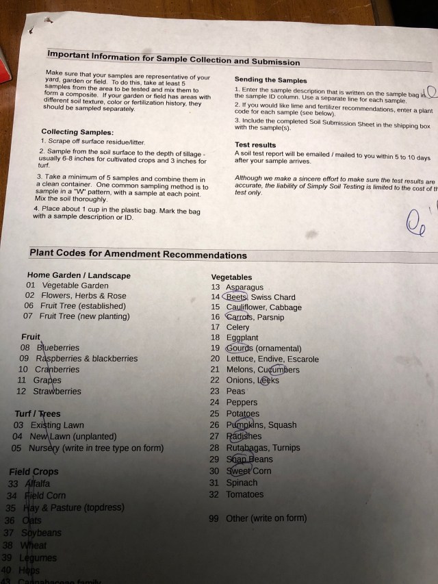 It’s rather interesting how they have things laid out on their testing form. It lists a vegetable garden option, (01) but then lists out different vegetables-as if maybe beets (14) & carrots (16) shouldn’t be in the same garden!? As well as pumpkins (26) and gourds (19) in different categories….can they not go in the same patch? These numbers are only used if you are asking for lime & fertilizer recommendations…which we are, in addition we ordered a full comprehensive test to check all minerals, ph, soil composition and density. So hopefully-my request won’t seem too crazy when they get my paperwork! My final paperwork I sent them isn’t the picture below, I promise it wasn’t that messy, it was probably dirtier, but not messier!