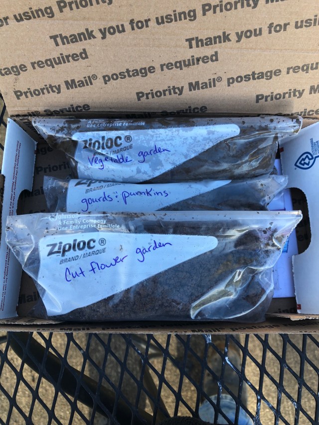 FINALLY!! The soil testing kit came in the mail! I ordered it from a company in Burlington, WA, http://www.simplysoiltesting.com/ not very far away from the Floret Flower Farm – where I ordered my seeds from…the soil testing kit took longer to get here than the seeds!!!