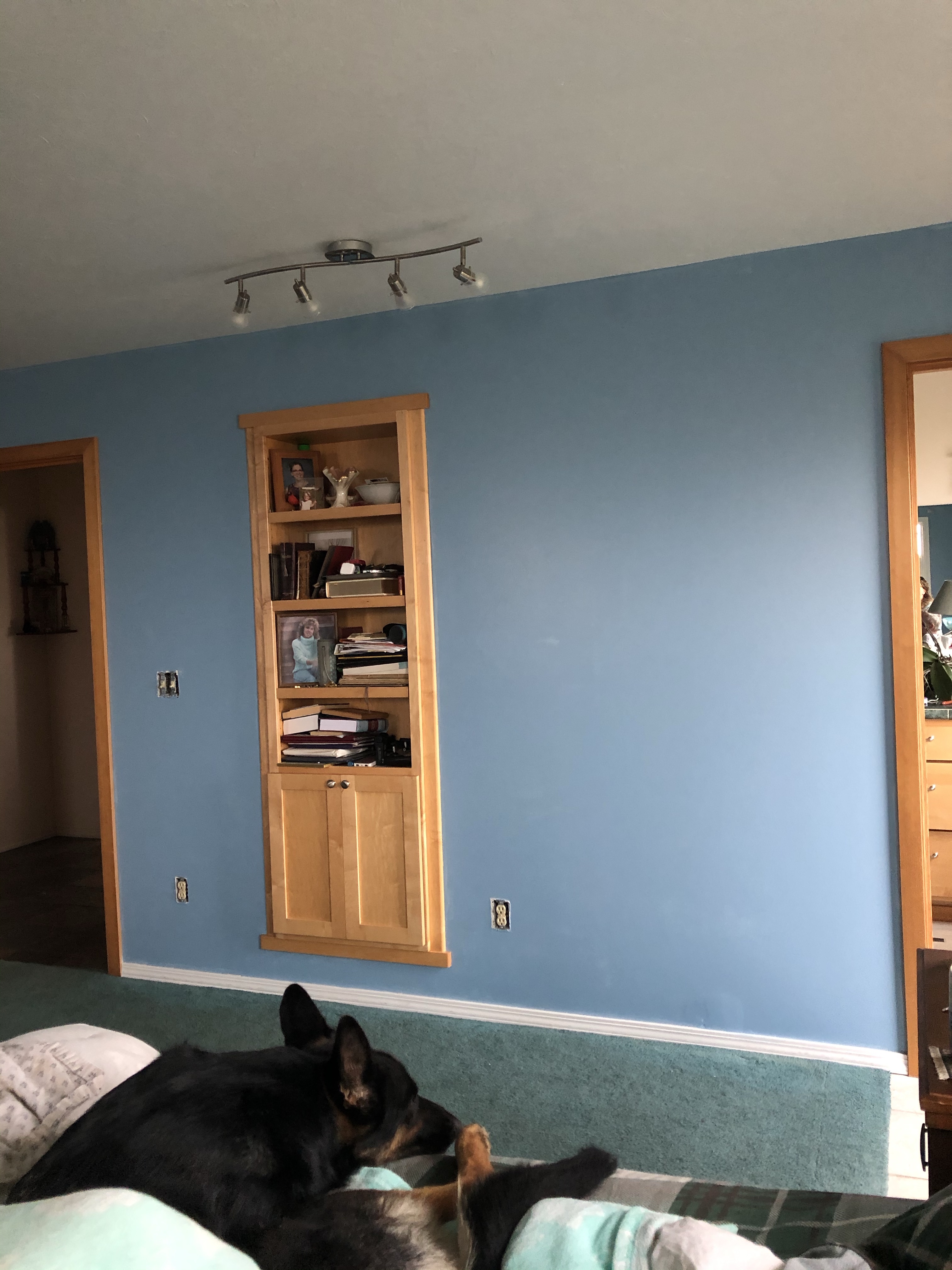 Joe has done a beautiful job of repainting the room, and redoing the floor – more than I could ever have hoped for. We chose resolute blue for the walls and a nice gray oak floor.