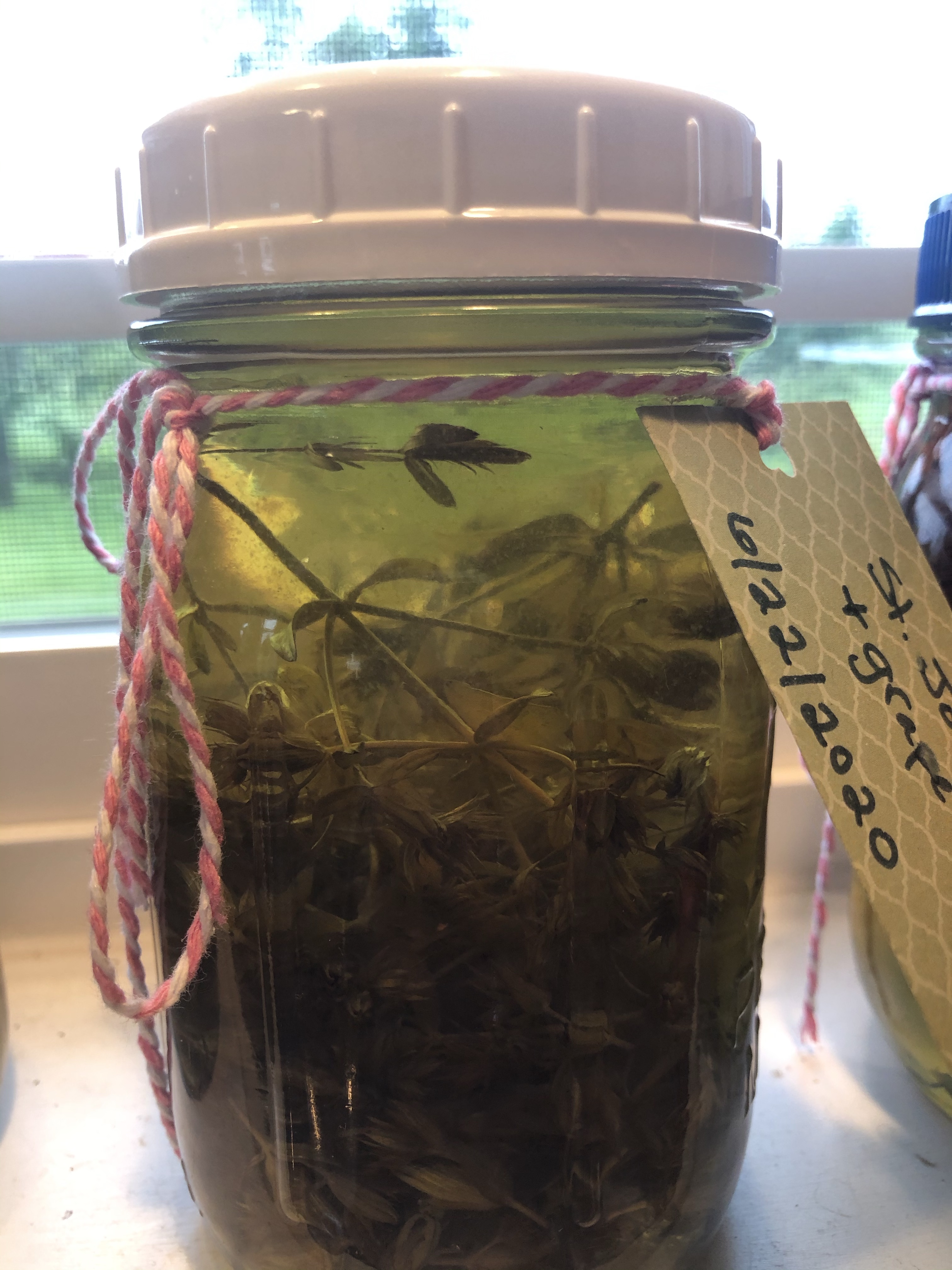 My St. John’s Wort is still not turning red, I did more reading on the internet to find out that it is important that it is solar infused – well, it’s a bit difficult to have it solar infused when a) my window faces west and the sun doesn’t arrive until well into the afternoon and b) there’s no damn sun to be had expect for maybe three days of it since I put it in the jars! I see there are a few days of part sun in the future, I’ll take the jars out and set them on the patio for the sun to hit them first thing in the morning and work on them a bit more