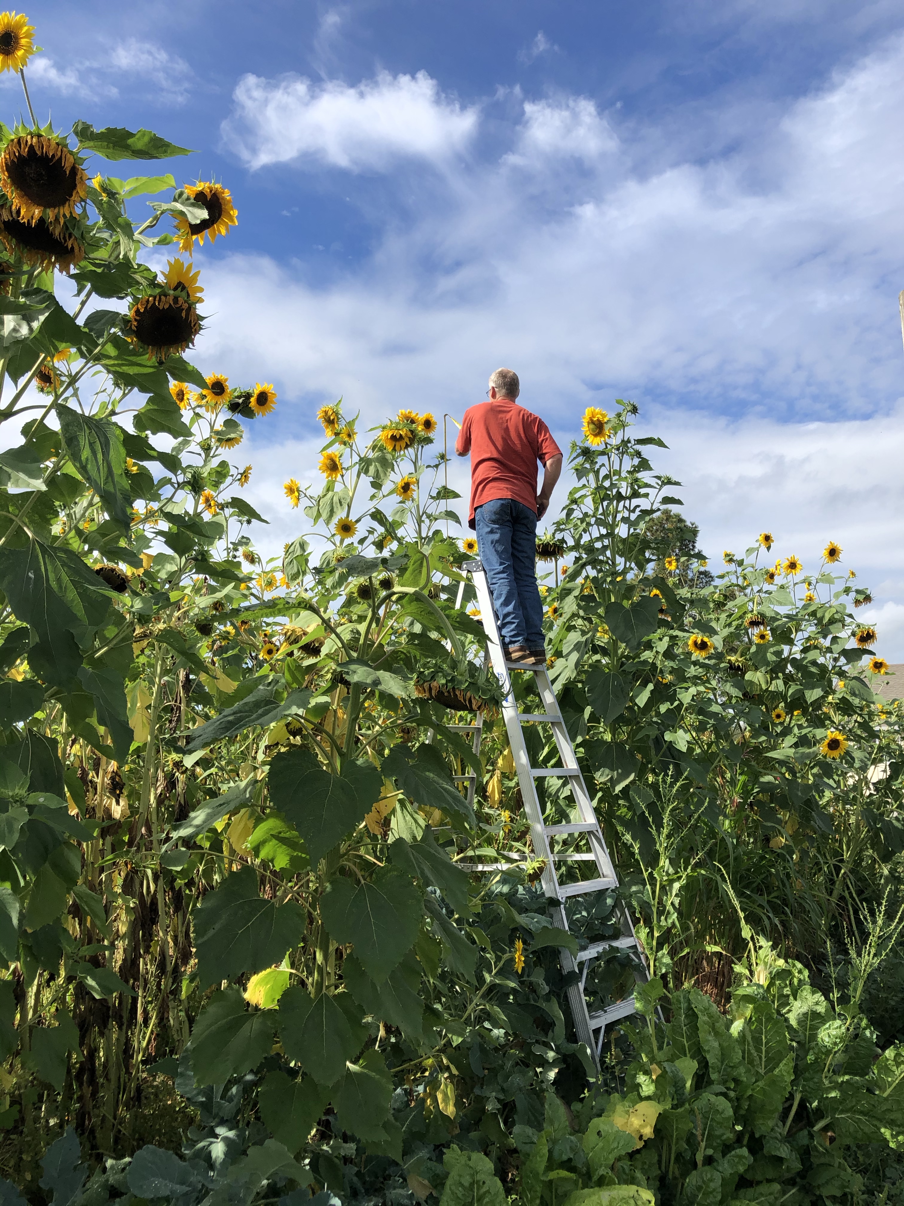 I haven’t utilized nearly enough of the volunteer sunflowers, but do they really all need to be sold-or can we just sit back and enjoy them? As of right now our tallest is 13 feet 4 inches tall – being a multi-stemed one, I’m excited to climb to the top of the ladder to harvest those soon.