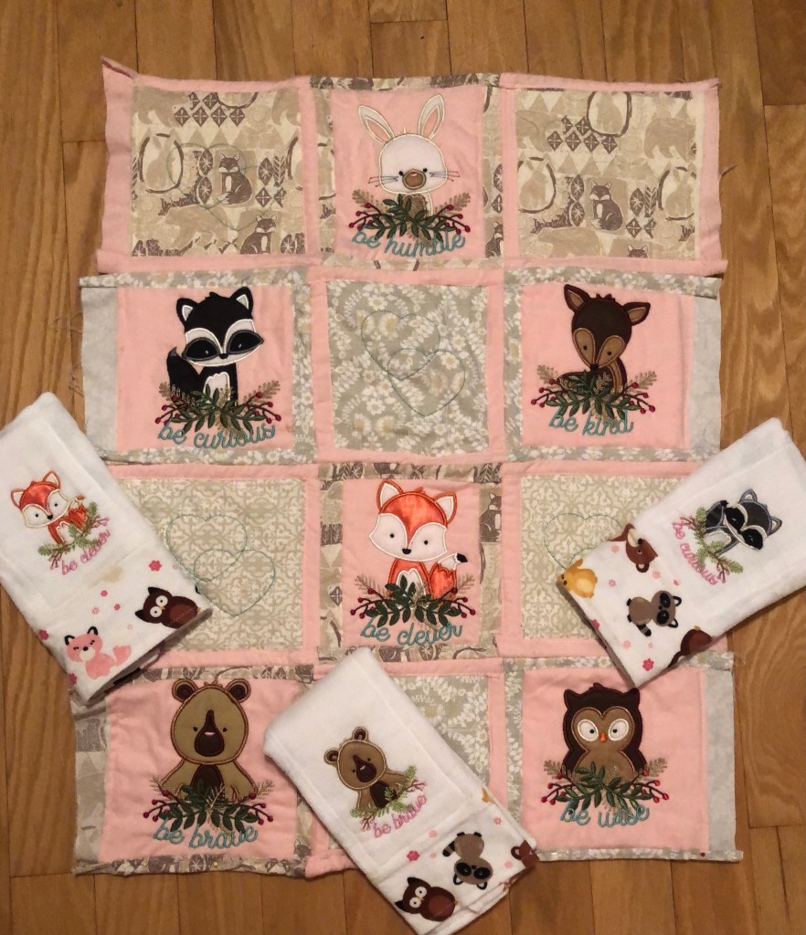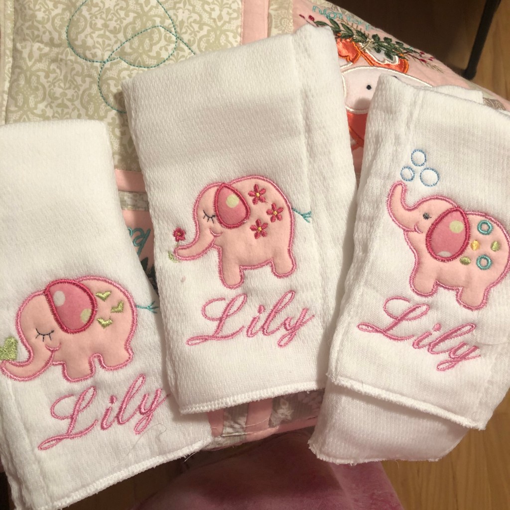 I finished the craft room-a bit of a small miracle really! The quilt as you go project for baby Lily is in its final stages, I’ve come up short in the lower left hand corner…I think I might have a fix, we’ll see how that goes. I’ve stitched up six burp cloths also, still 3 remaining to finish. Nothing like getting down to the wire!