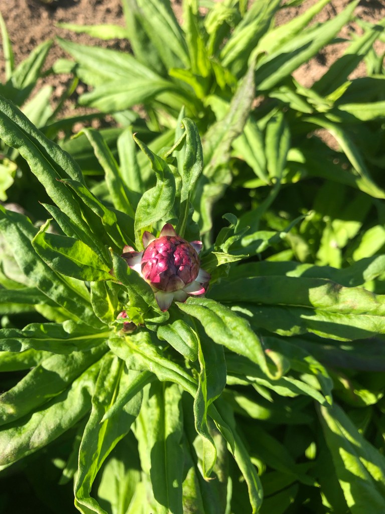 I have a few heads on the strawflowers peaking through their lush green leaves.