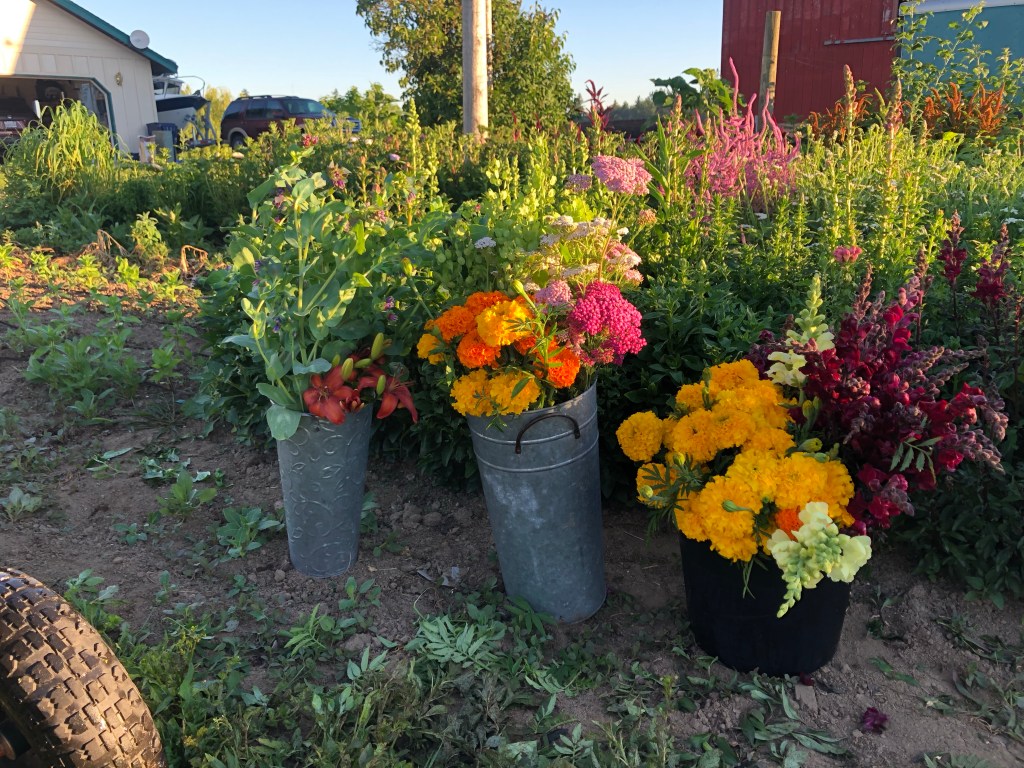 I picked a good deal of flowers this morning at 5 a.m. I’m not entirely sure if I picked the right ones – ie – did they really need to be picked, will they hold up in the fridge, did I make good choices? I will see how it goes for putting bouquets together tomorrow night – or super early Monday morning.