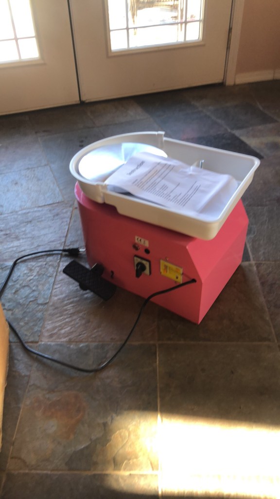 I promised myself I wouldn’t open my new wheel until I finished my test….when it arrived on Thursday, Joe packed it in. I walked away from it defeated saying I couldn’t open it yet, I didn’t finish my test. Joe whips out his knife and says “good thing I’m here then” he’s a helper! So, it was opened, and it is as cheaply made as all the reviews say it is, but goodness, it was cheap to purchase also. I did happen to have 30 minutes to spare yesterday before class, so I hurried up and played for a bit before putting together a donation bouquet and heading to clay class. I did managed to throw a cylinder…not perfect by any means, but it will work for centering practice and little pots.
