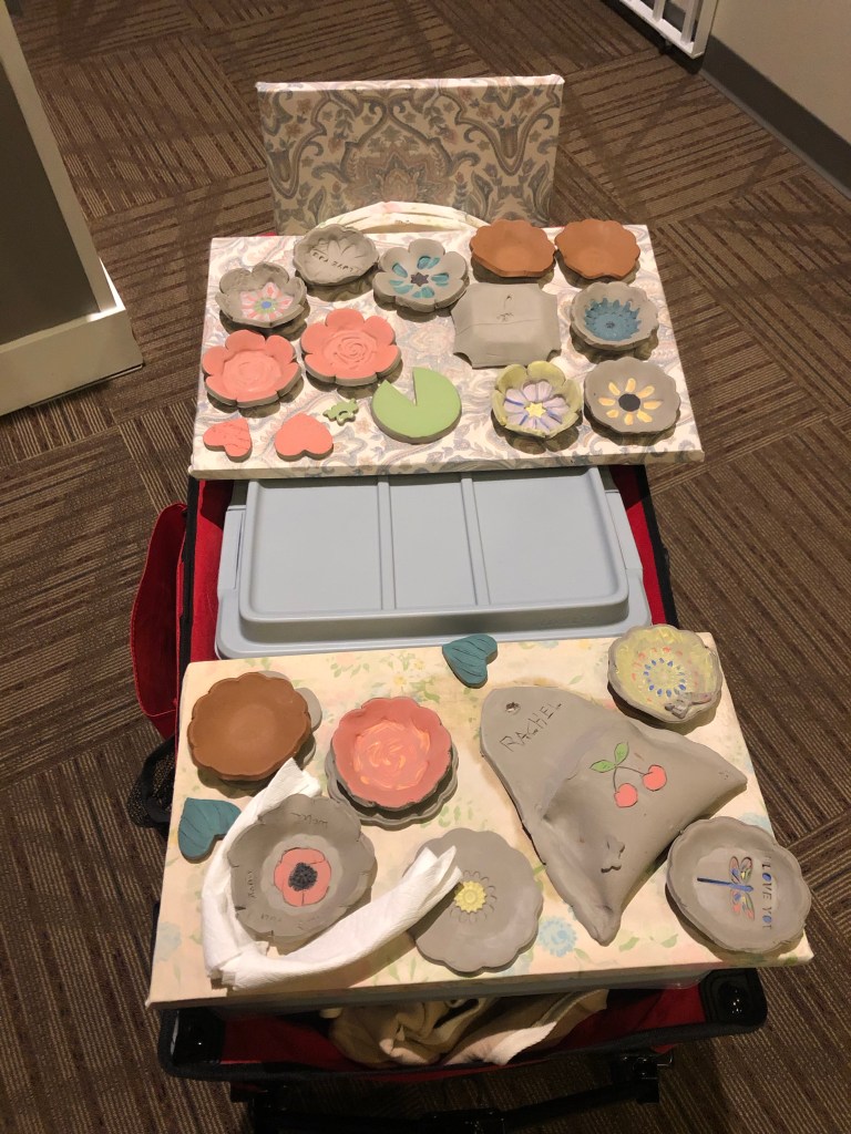 Yes, I led a class of four people on how to make the cute little trinket bowls and wall pockets that everyone loves so much! There really isn’t much to teach, it’s rolling out clay and having the right equipment. A fellow flower farmer/florist reached out to me with the idea to have me come lead a little class with her grief group, originally there was supposed to be 8 people, but there was some illness that prevented the other 4 from coming. It turned out to be a wonderful group of lovely ladies and they produced a lot of cute things! I’m looking forward to firing them, then putting on a clear glaze for them and firing them again. They all did a wonderful job of putting their own spin on the dishes! I hope they love them as much as I do!