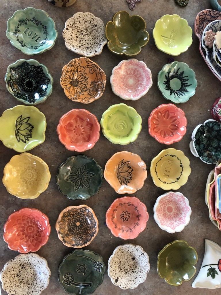 I went through my pottery pieces to take inventory. I meant to mark prices on all of the items, but packed them away after writing them all down in my little book. I think I ended up with 33 trinket dishes – hopefully I can sell over half of them, it would be nice to sell all of them, but we shall see. I have two friends that have put dibs on items already, so thankfully I have at least two sales. I didn’t end up with nearly as many pots as I was hoping, and the ones I did end up with are a bit tiny….it’s okay, things will move on out hopefully, and I can make room for more. I’m packing up my tools to move them outside, now that it’s decent outside, I can start working in the garage. I’ve asked Joe to move up a workbench to stash things outside the garage door on the south side of the house, out of sight of company, in the shade for when the weather heats up and a nice little area to keep all my crap while I play with clay this summer. One of these days I will have a room in the barn where I can put things – instead of having all my stuff in the kitchen. Hopefully I can avoid bringing in projects for several months. We shall see what Fall and Winter have in store for us this year. Who knows what will happen when school starts again.