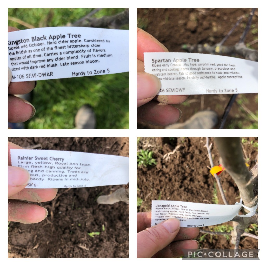 Yesterday we went looking for fruit trees up to Cloud Mountain farms. Last year we made the mistake of waiting until May or June…something like that and missed out on trees. We were told we needed to come up in February, but we didn’t listen to them – but we haven’t had time, until this weekend. Thankfully they did indeed have a few trees Joe wanted to add to the new orchard we are installing. We found three apple trees & a cherry tree. The anticipation of the fruit we will have from the trees a few years from now is very exciting, thoughts of apple cider, cherry apple crisp & apple pies are dancing through my head. One of my friends once mentioned a quote I had never heard before – the best day to plant a tree was 20 years ago, the second best day is today. Last year we did add a few trees in honor of the grandkids, but none of them were fruit trees.