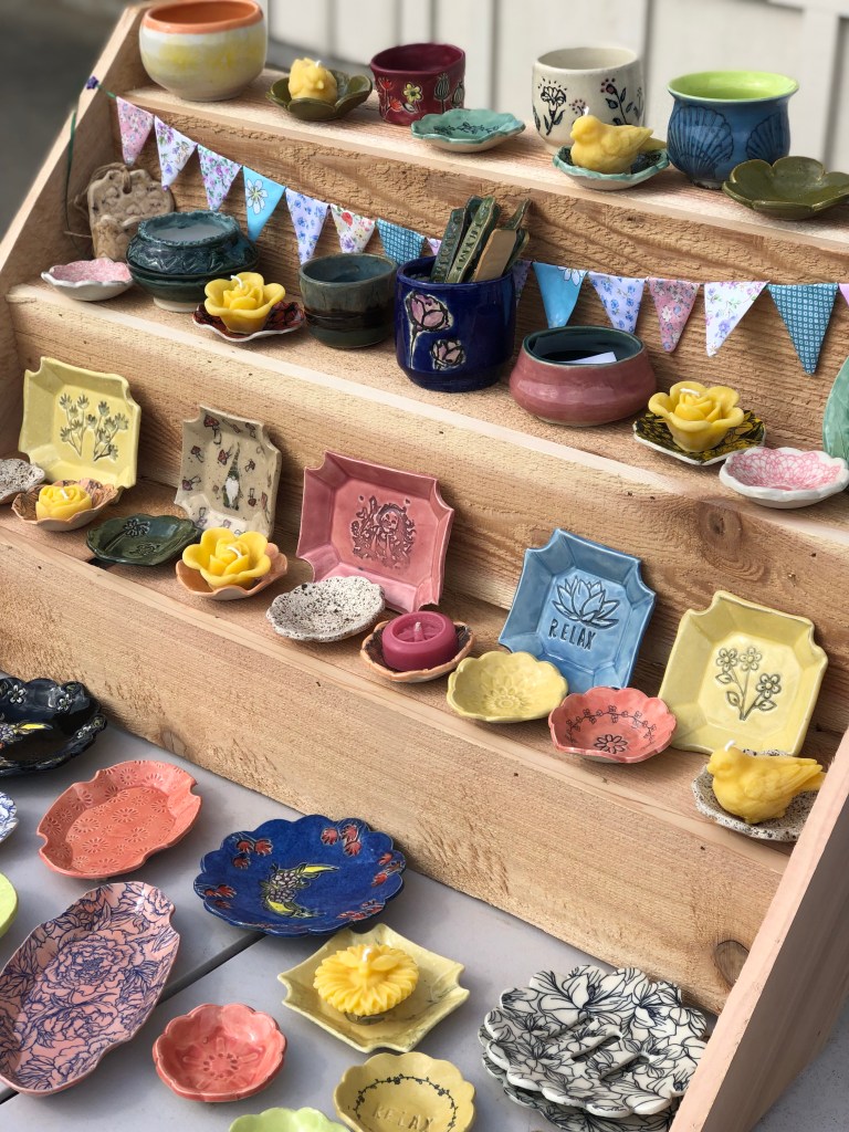 I actually took part in a Farmers Market yesterday, something I said I would NEVER do, but here I am…. – I was the only one with pottery & the only one with seedlings – so that was super nice! I ended the four hour night ahead of the game financially, but certainly put a lot of effort and time into getting ready, but that is how things go! I think I will even probably do it again! The cute little display shelf Joe made me certainly made life soooooo much eaiser!!