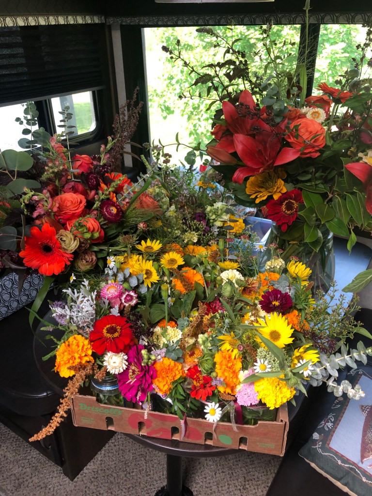 The garden is finally producing flowers. My Asters & Bells of Ireland were a complete disaster….as in…they didn’t make it at all. The green amaranth was an inch tall, the burgundy and orange were not very good, but I managed to get a bit out of it for my daughter’s wedding. The Cosmos, Zinnias, Marigold beasts, Strawflowers (the very few I planted), Mexican Hats, Statice, and even the Dahlias are doing well. I think the Glads just might have blooms for me before the end of the season, but I’m not sure yet – they were put in there soooo super late! I have another flower that is doing well, but have no clue that the name of it is, and haven’t had time to go investigate my bags of seeds to see what it is. It’s very pretty…