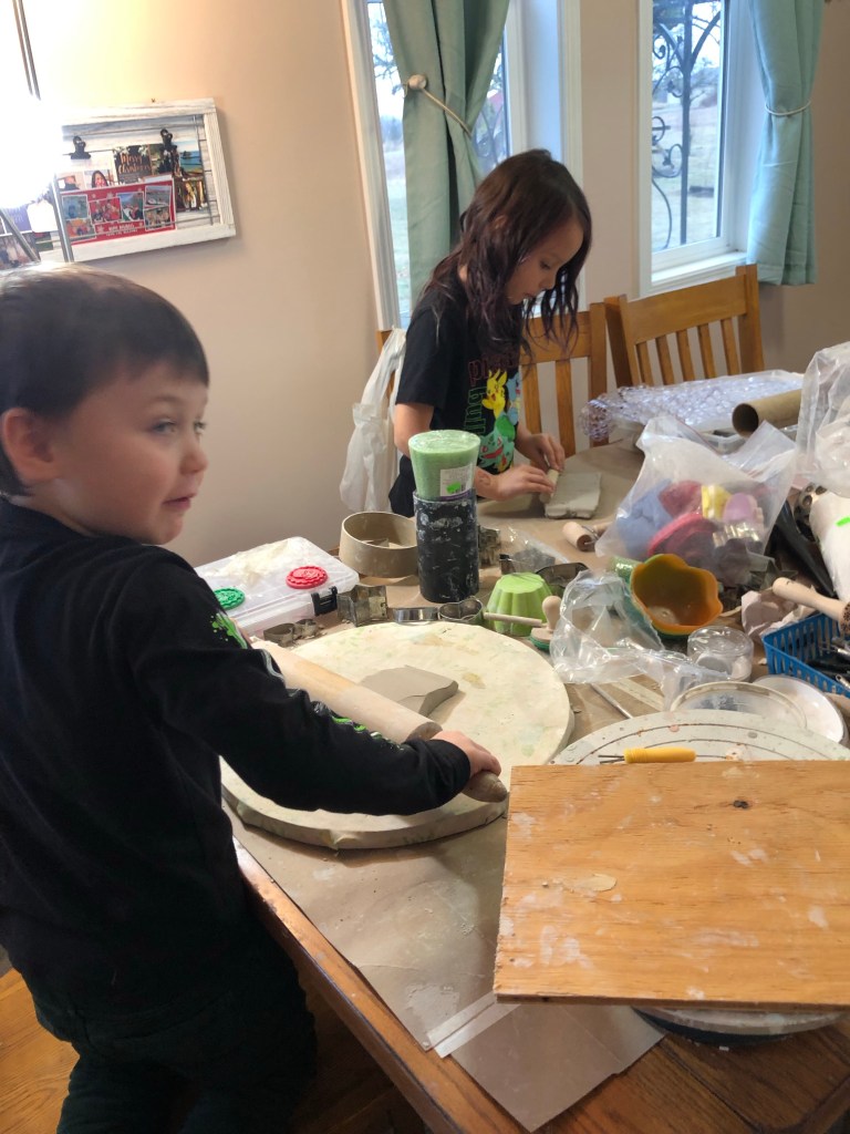 The grands were here today, usually we like to go outside and play, but it rained the entire time they were here (which didn’t stop us last weekend) but we decided to stay in and play with clay. They both had such a good time, designing their own plates, picking out there underglaze transfers and cutting out their plates. It was so much fun to watch them create and do their own special projects not only for themselves but for their parents too!